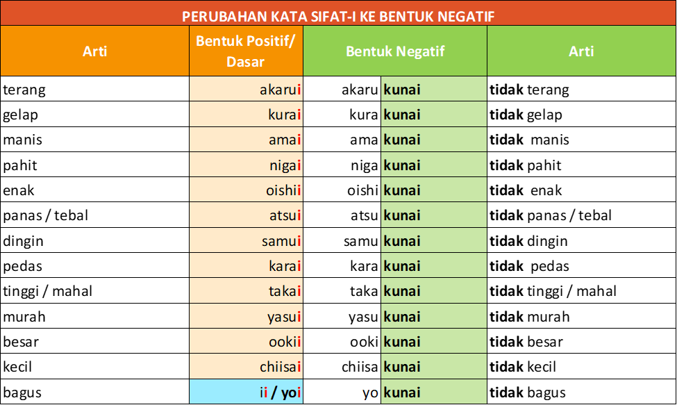 Perhatikan pada kata sifat “ii / yoi” yang artinya “bagus”, ketika diubah ke bentuk negatif menggunakan kata “yoi” saja dan menjadi “yokunai”.